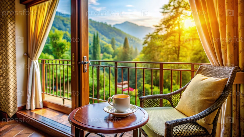 Утренняя безмятежность с балкона роскошного отеля с видом на пышные горы
