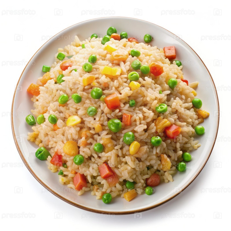 Удивительная тарелка жареного риса с овощами на белом фоне