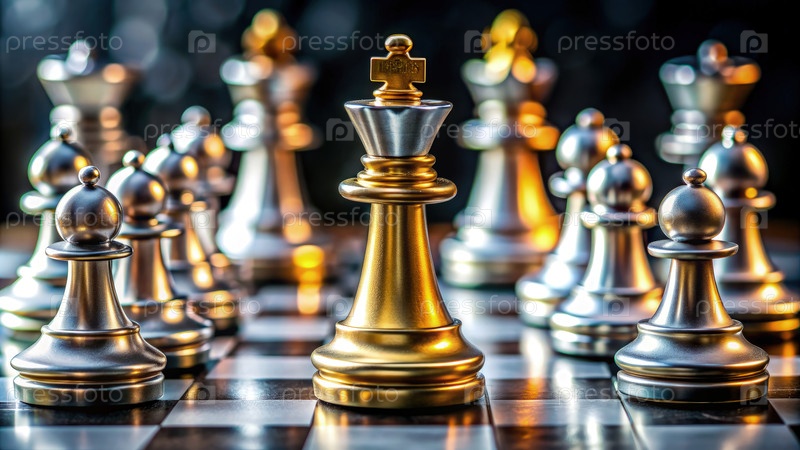 Золотые и серебряные шахматные фигуры расположены на шахматной доске во время стратегической игры