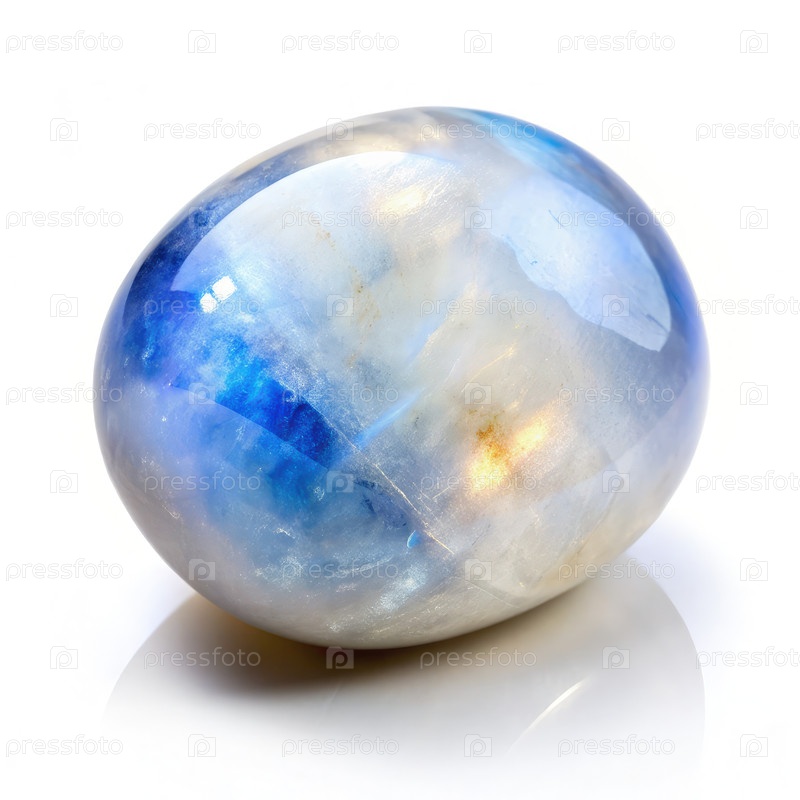 Драгоценный камень лунного камня на белом фоне, подчеркивающий его яркие оттенки