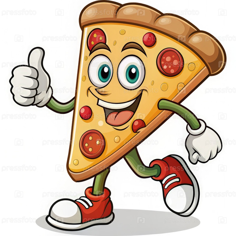 Пешеходный кусок пиццы, поднимающий большой палец в веселую городскую обстановку