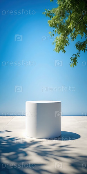 Простая белая трибуна стоит на фоне чистого синего неба, создавая минималистическую зону отображения в наружной обстановке днем
