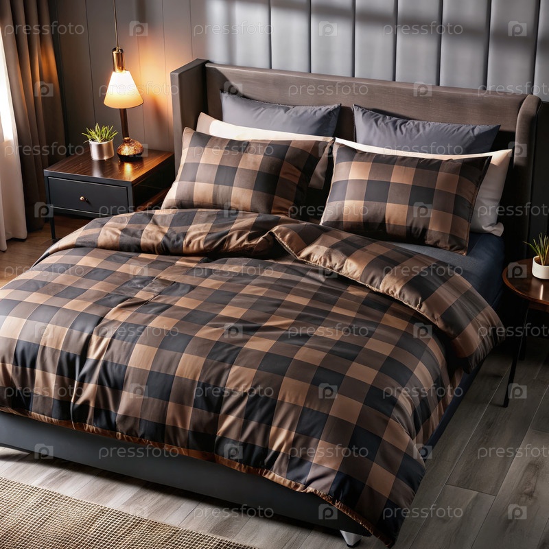 Уютный набор постельного белья с пластинковым дизайном в современной спальне ночью