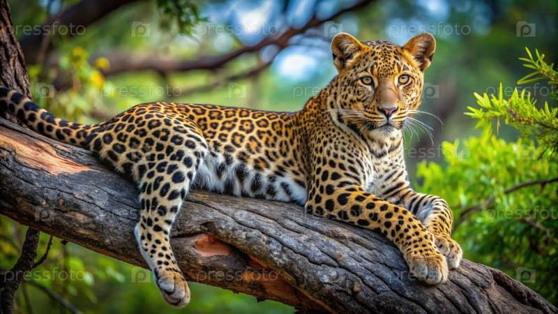 Леопард, лежащий на ветке в спокойной лесной местности