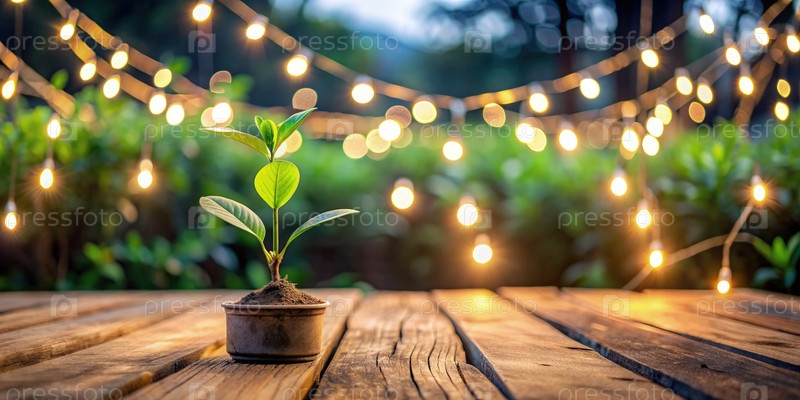 Молодое растение проростает, процветая на деревянном столе под теплыми фейри-лампами в сумерках