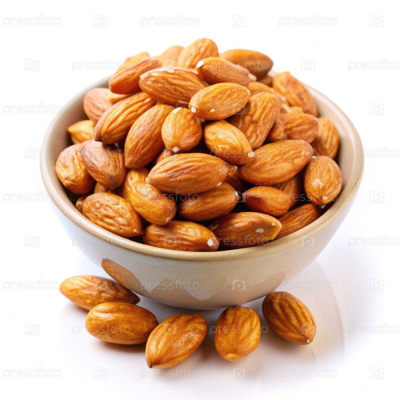 Миндаль, накопленная высоко в миске на чистом белом фоне, захватывает естественную доброту