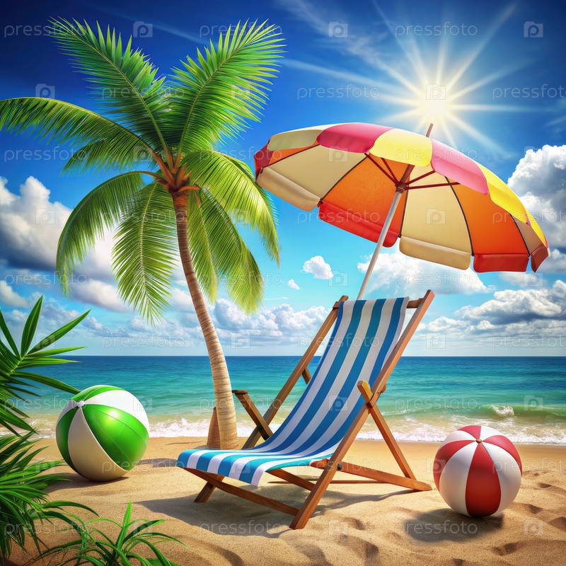 Наслаждайтесь ярким летним днем на пляже с красочными зонтиками, шезлонгами и игривыми пляжными мячами под ярко-синим небом