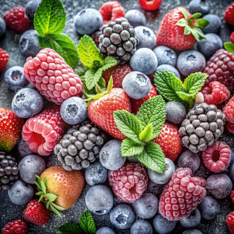 Различные типы замороженных фруктов отображаются на текстурированной поверхности