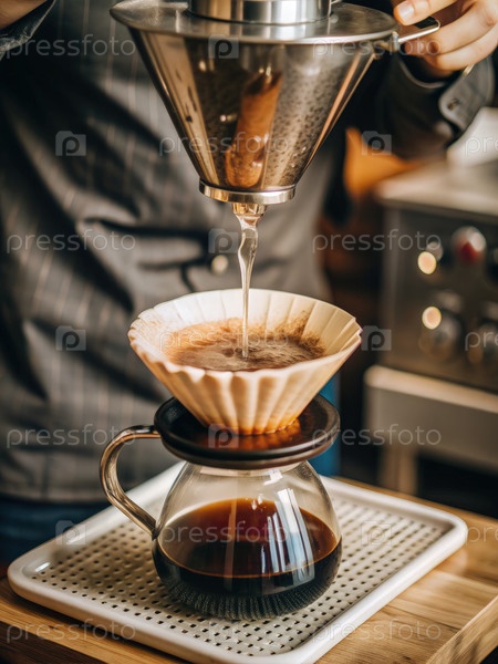 Заваривание богатой чашки кофе в воронке с помощью сервера, демонстрация искусства приготовления кофейного напитка на уютной кухне