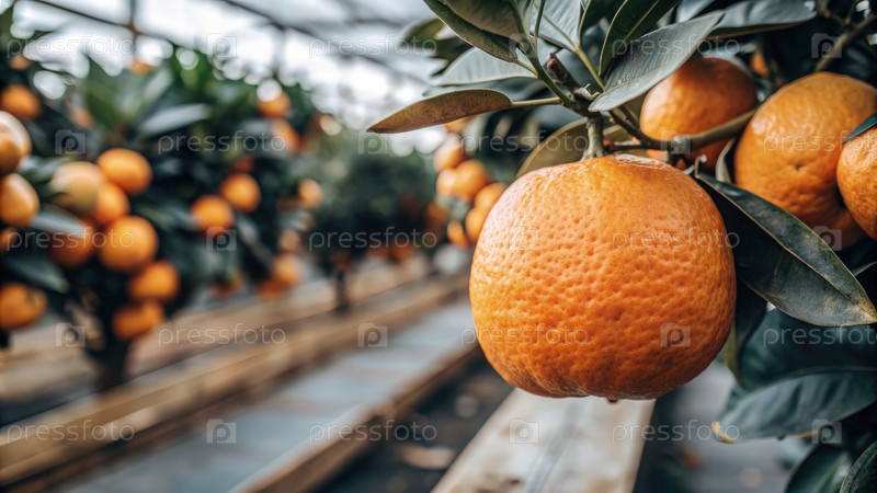 Близкий план зрелого апельсинового фрукта, висящего на деревьях в оранжевом саду с пышной зеленью и рядами цитрусовых растений под солнечным светом