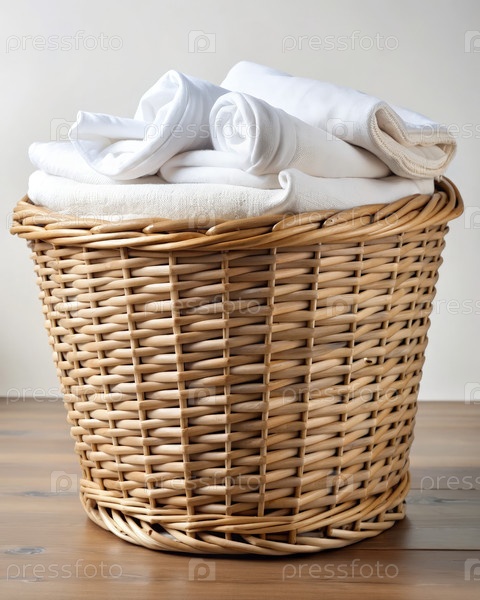 Корзина для стирки из смолы, заполненная чистым белым постельным бельем в аккуратном интерьере
