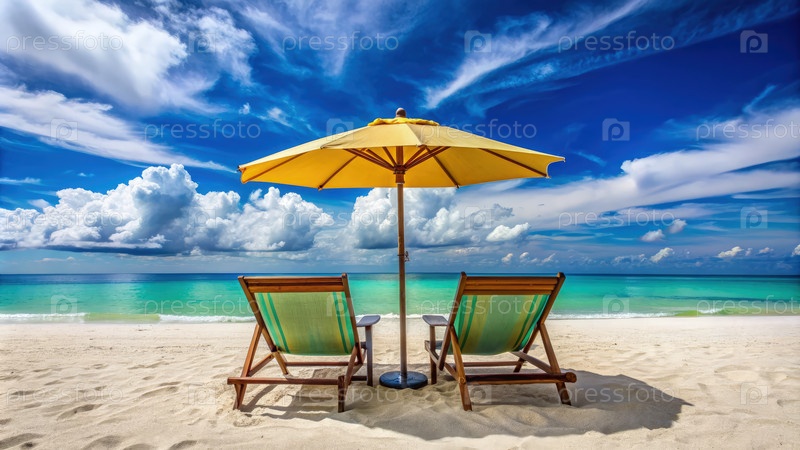 Два пляжных кресла с желтым зонтиком дают тень на песчаном берегу под ярким небом в солнечный день