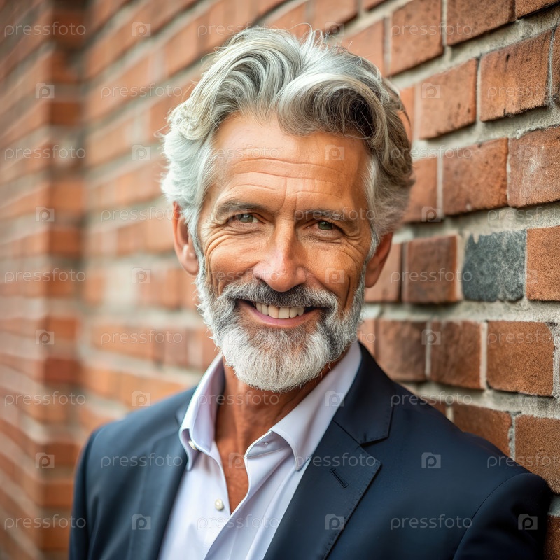 Элегантный пожилой мужчина позирует против кирпичной стены в городской обстановке во время Золотого часа