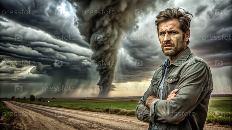 Человек стоит рядом с торнадо на открытом поле во время штормовой погоды