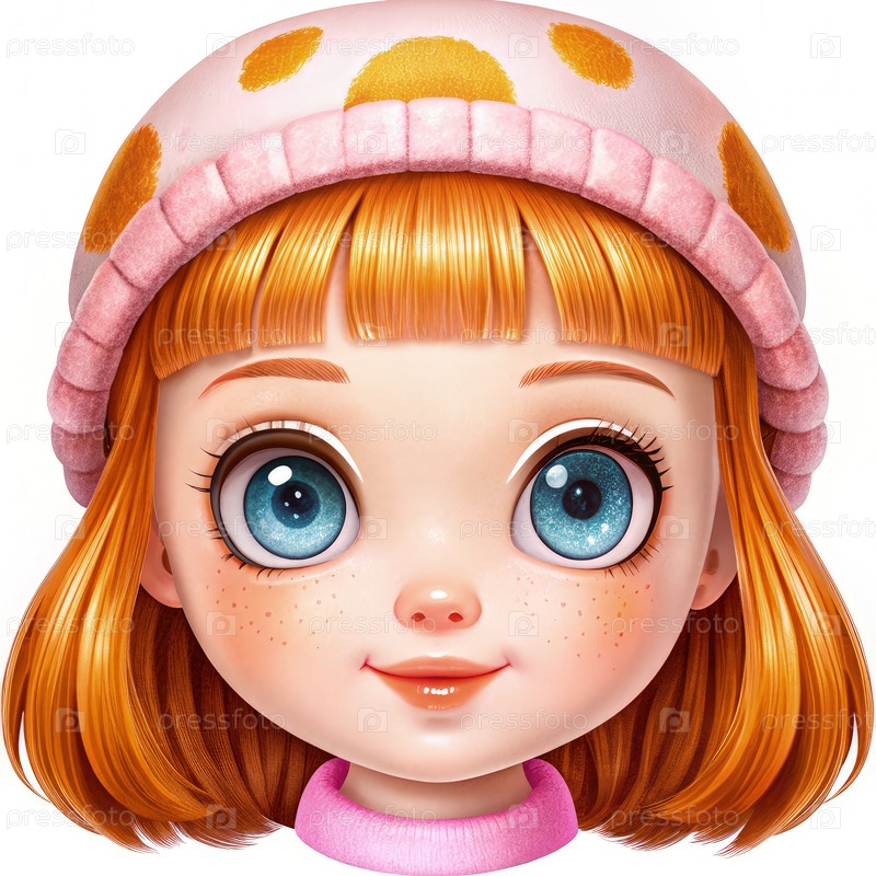 Милый мультфильмовый персонаж с яркими оранжевыми волосами и голубыми глазами, одетый в розовую шляпу с точками полки, весело улыбающийся в причудливой обстановке