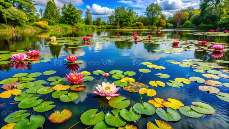 Лилия пруда с яркими цветами и пышной зеленью под солнечным небом