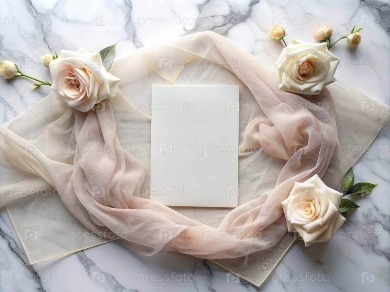 Элегантное приглашение на белом мраморном столе с мягкой тканью и розами