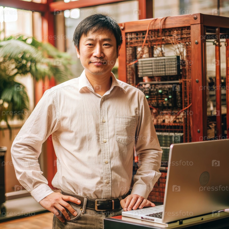 Китайский мужчина рядом с супермощным вычислительным устройством в современном рабочем пространстве