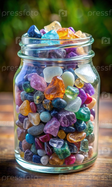 Красочные сырые драгоценные камни отображаются в стеклянной банке на деревянной поверхности