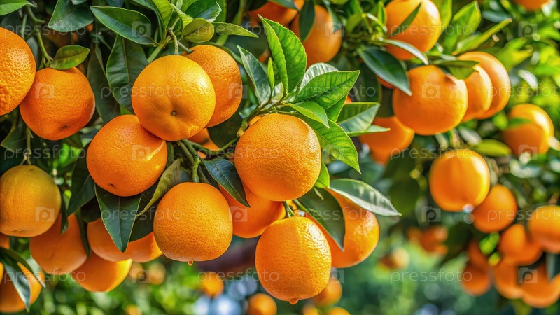 Свежие апельсины, висящие на дереве в солнечном саду во время жатвы