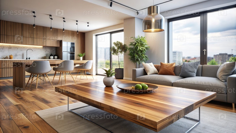 Современная гостиная имеет деревянный стол и изящную мебель в просторном дизайне