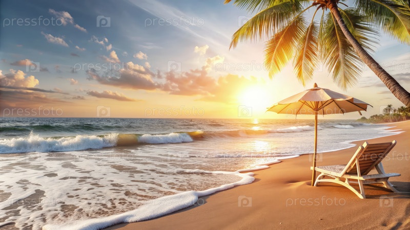 Спокойный закат солнца на спокойном пляже с мягко лапающимися волнами, качающимися пальмами и уютным креслом в ожидании отдыха