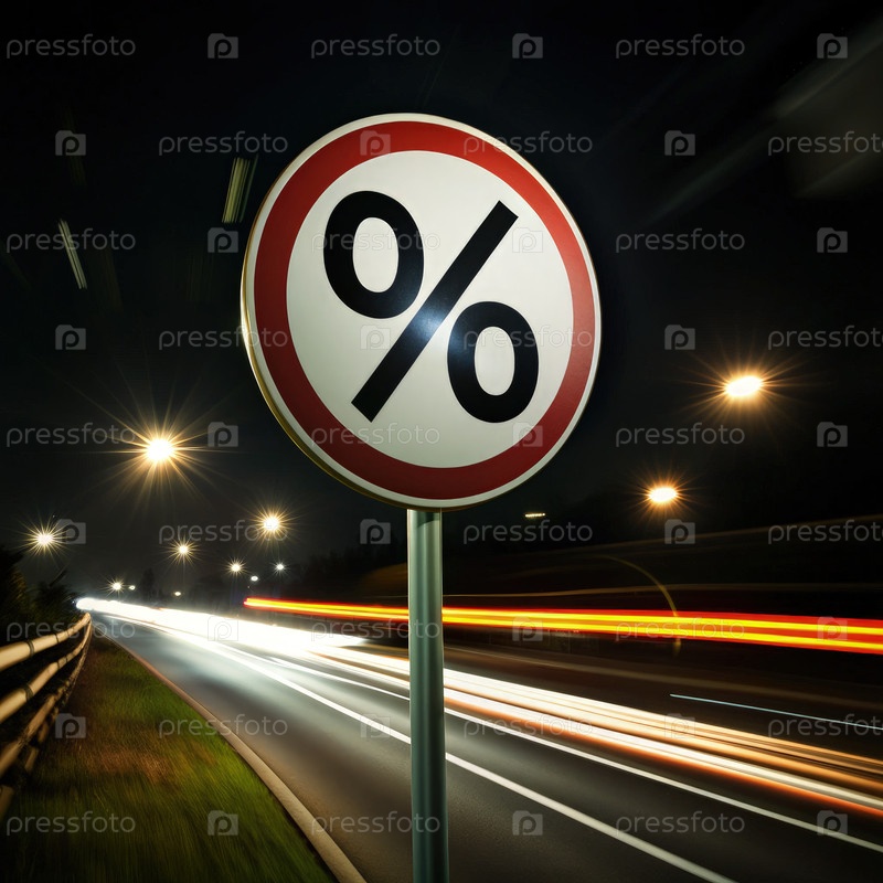 Круглый дорожный знак, указывающий процент вблизи оживленной автомагистрали ночью