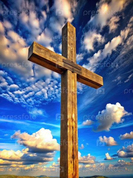 Деревянный крест на драматическом небе с облаками во время заката в спокойной окружающей среде