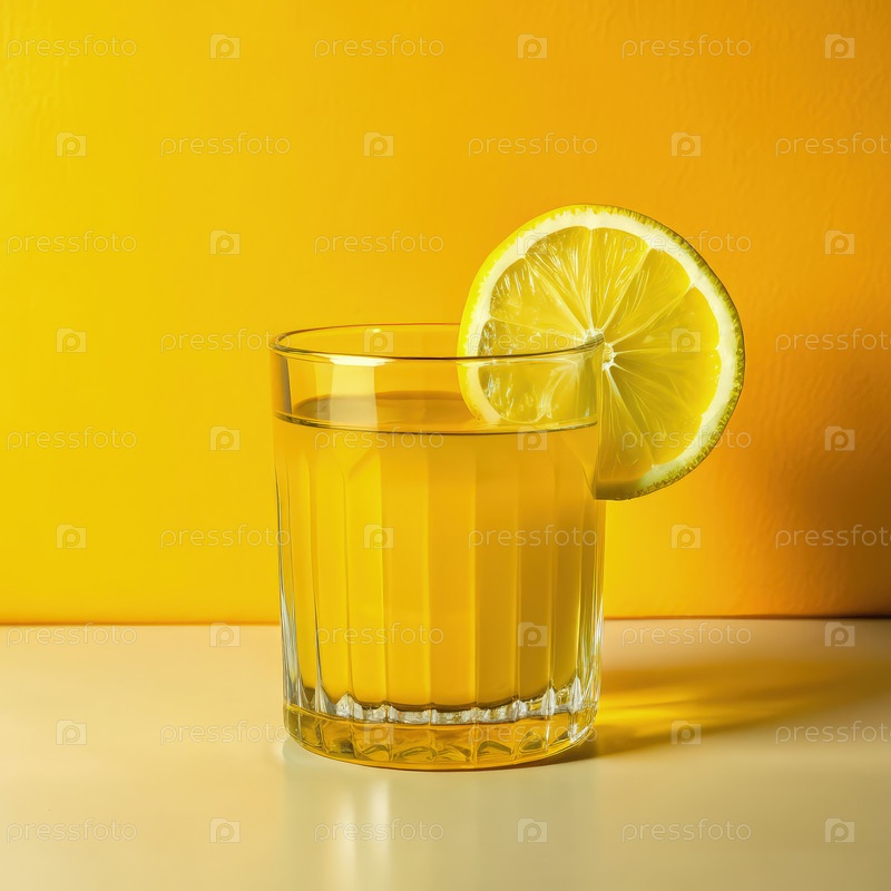 Свежевыжатый лимонад в прозрачном стакане с кусочкой лимона, установленный на ярко-желтом фоне
