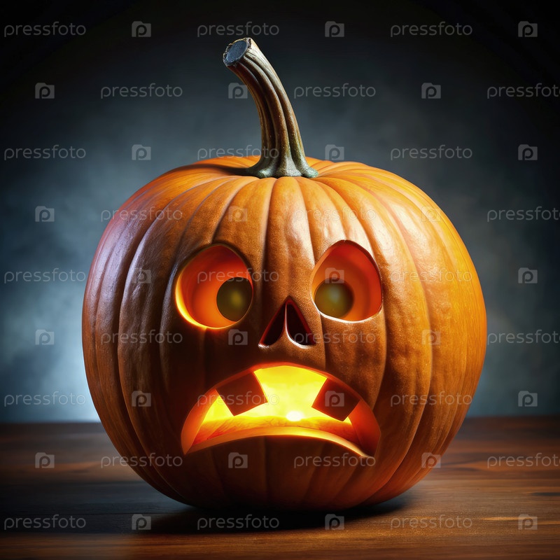 Испуганная тыква с светящимся выражением лица, отображаемая в слабо освещенной обстановке