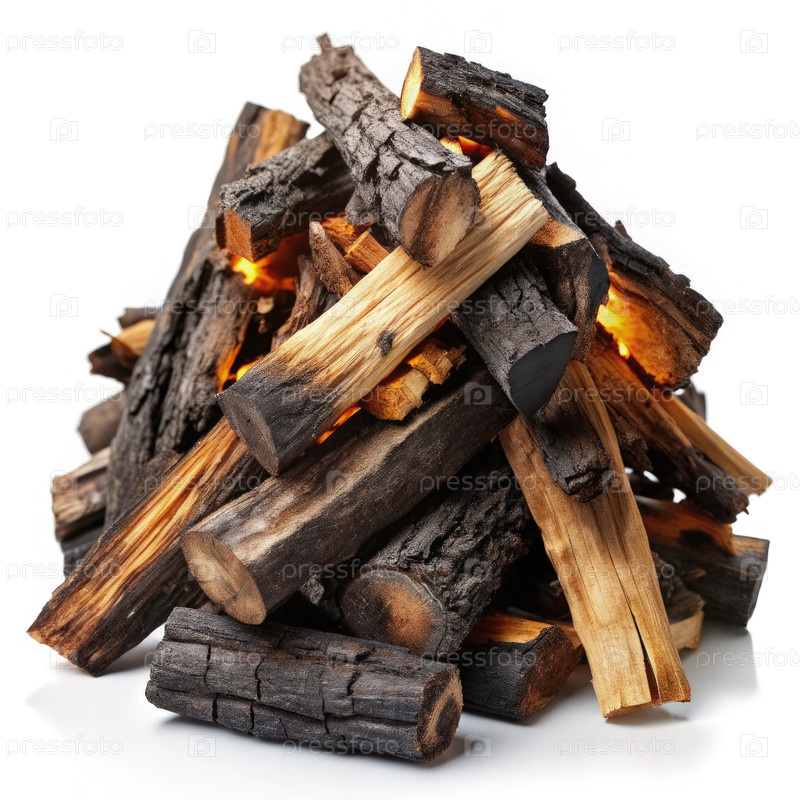 Горящая куча древесины с обожженными бревнами на белом фоне