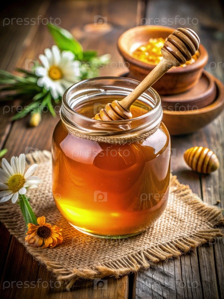 Банка с медом, деревянным диппером и цветами на деревянном столе