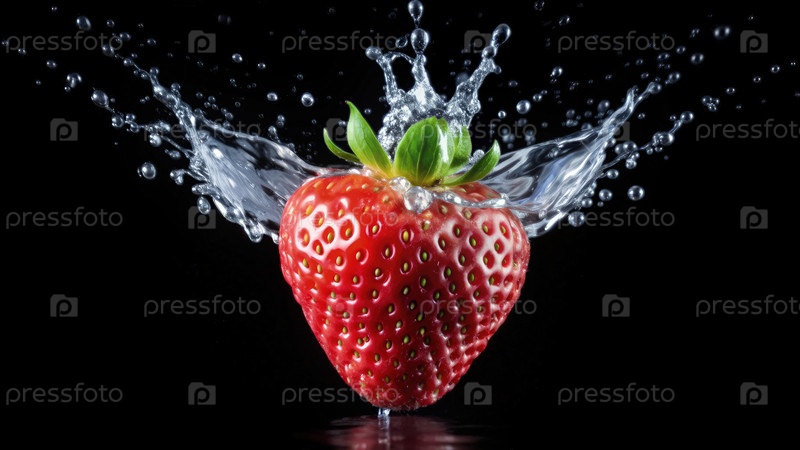 Вода брызгает на спелую клубнику на черном фоне