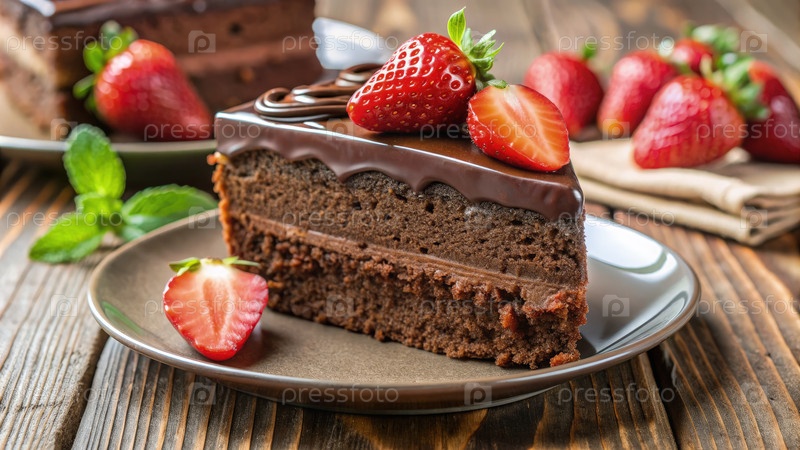 Вкусный кусочек шоколадного торта, подаваемый со свежими клубниками на деревянном столке