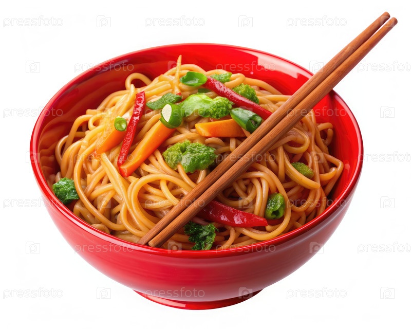 Вкусные пончики Lo Mein с свежими овощами и палочками в ярко-красной миске