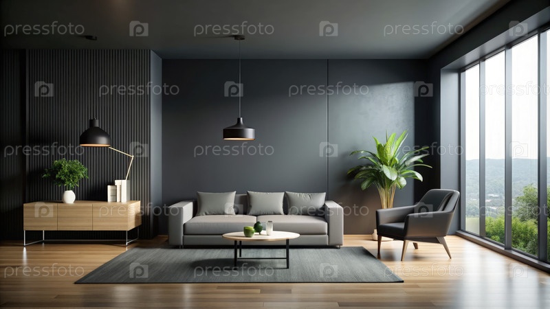 Минималистический дизайн гостиной в пространстве с черными стенами и естественным светом