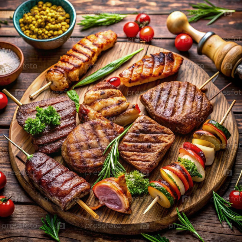 Горячая говядина, курица и свинина подаются на деревянной тарелке с свежими травами и овощами на летнем барбекю