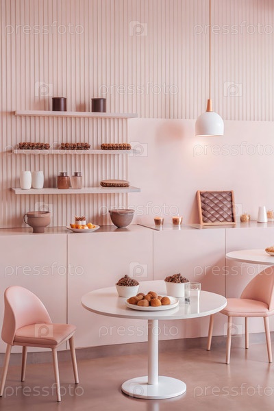 Очаровательный интерьер кафе, спроектированный в мягких розовых тонах с современной мебелью, демонстрирует приглашающую атмосферу для сладкого удовольствия