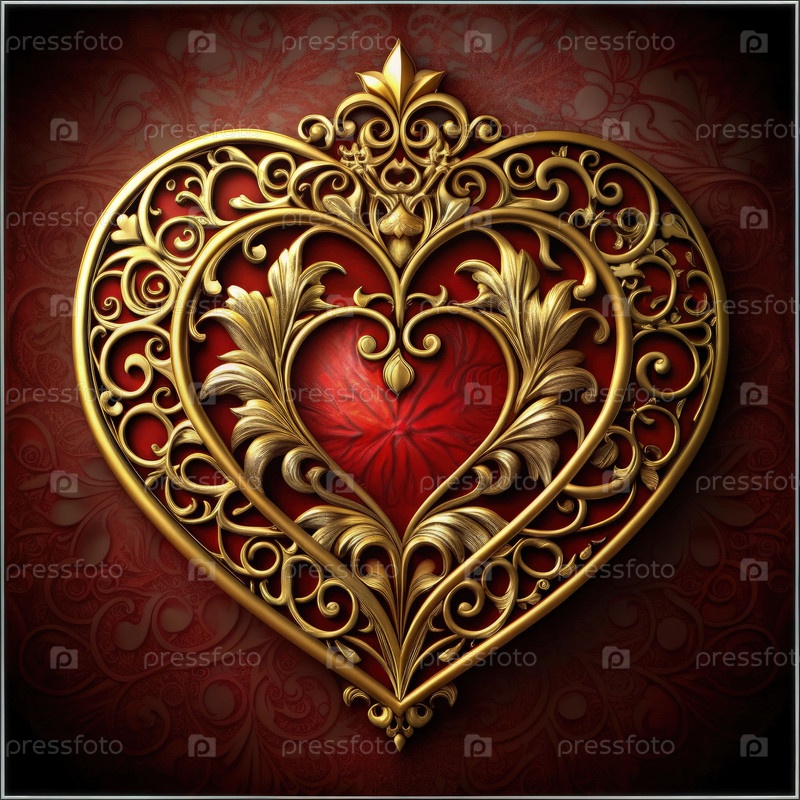 Элегантный дизайн золотого сердца с украшенными деталями на богатом красном фоне