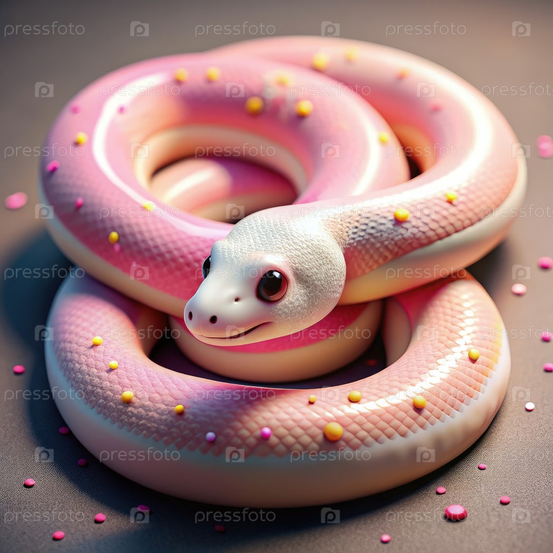 Милая белая змея, завернутая в розовую мороженую пончик и рассыпается на поверхности
