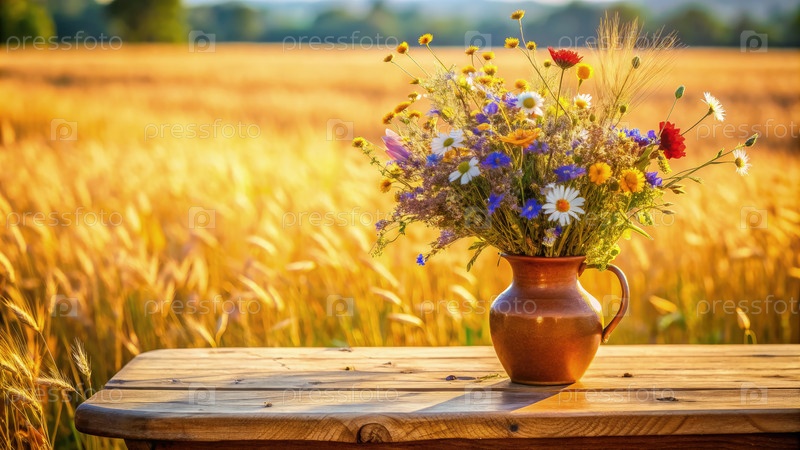 Рустический деревянный стол, украшенный яркой цветочной вазой на фоне золотистого пшеничного поля при закате солнца