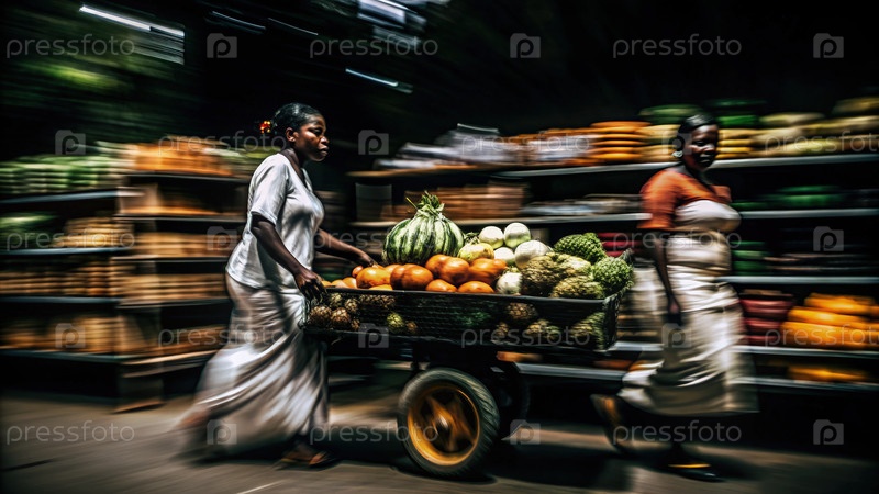 Женщины, перевозящие свежие продукты на оживленном рынке с акцентом на продовольственную безопасность в Африке