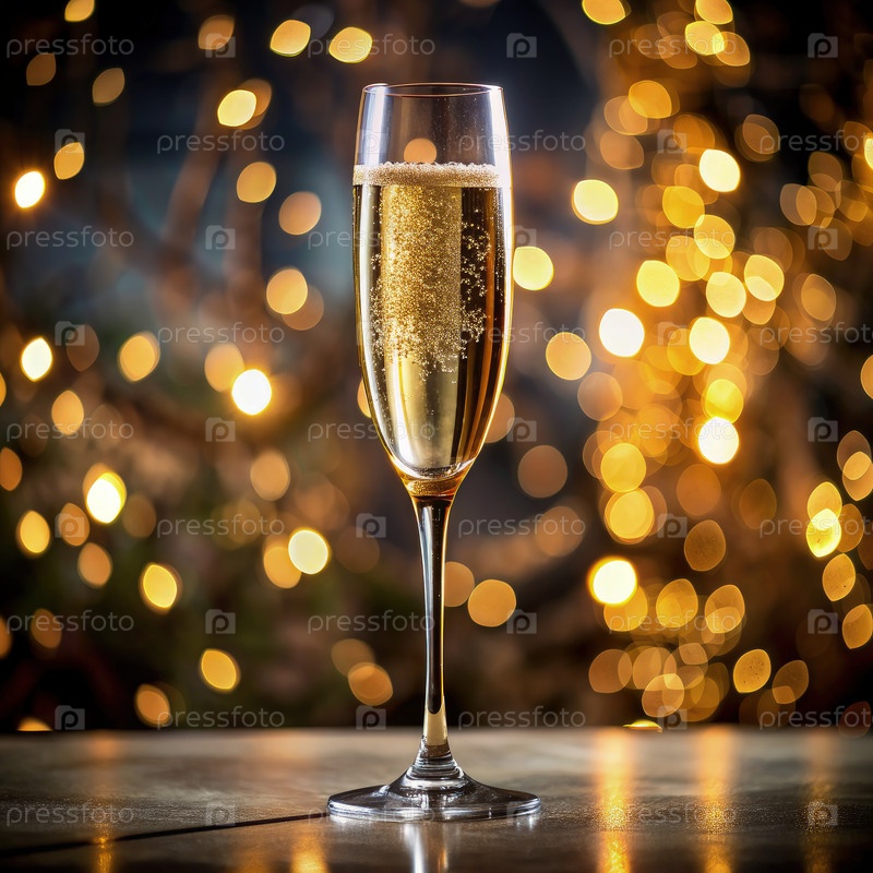 Сверкающий стакан шампанского изящно стоит на столе, окруженный мерцающими золотыми огнями во время праздничного торжества
