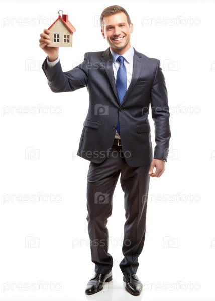 Счастливый мужчина в костюме празднует с ключом от дома в руке