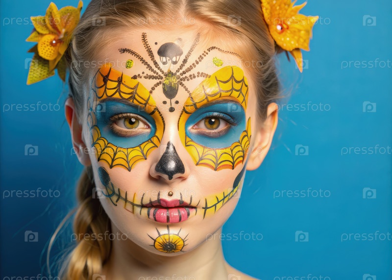 Девушка со сложным Хелоуином Рисунок лица с паутиной и черепом, украшенный желтыми цветами на ярко-синем фоне