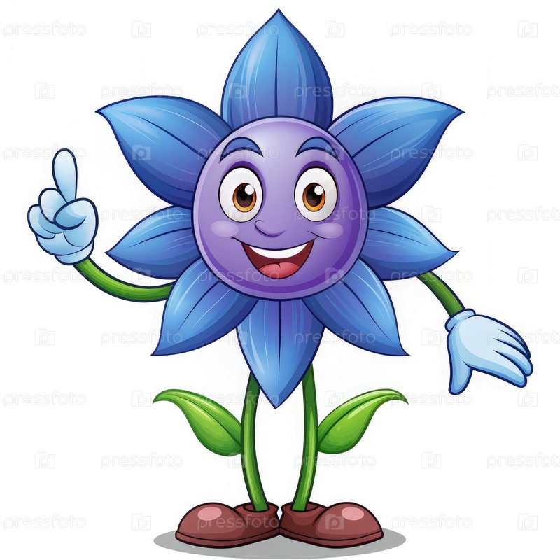 Веселый талисман синего цветка с улыбкой и поднятой рукой на белом фоне
