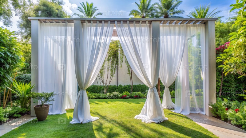 Элегантное наружное пространство с современными белыми шторами в пышном зеленом саду