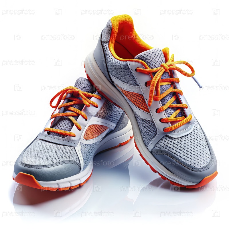 Серые и оранжевые кроссовки для бега, представленные на отражающей поверхности для отображения продукта