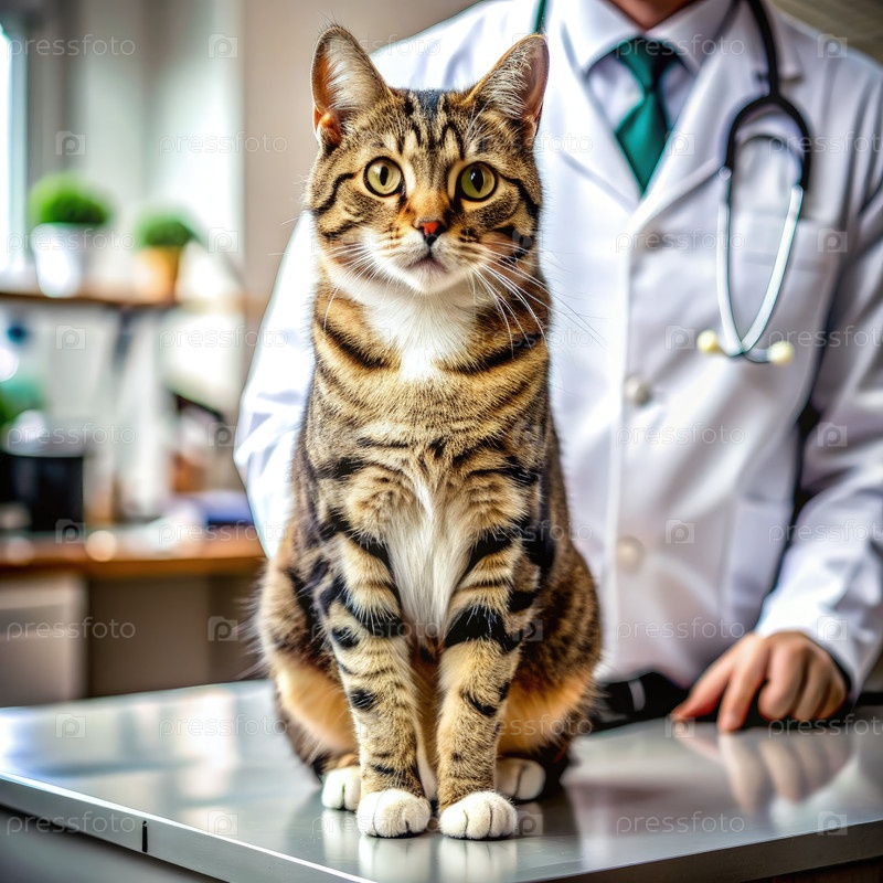 Табби-кошка взвешивается в ветеринарной клинике с ветеринаром в белом пальто неподалеку во время рутинного осмотра