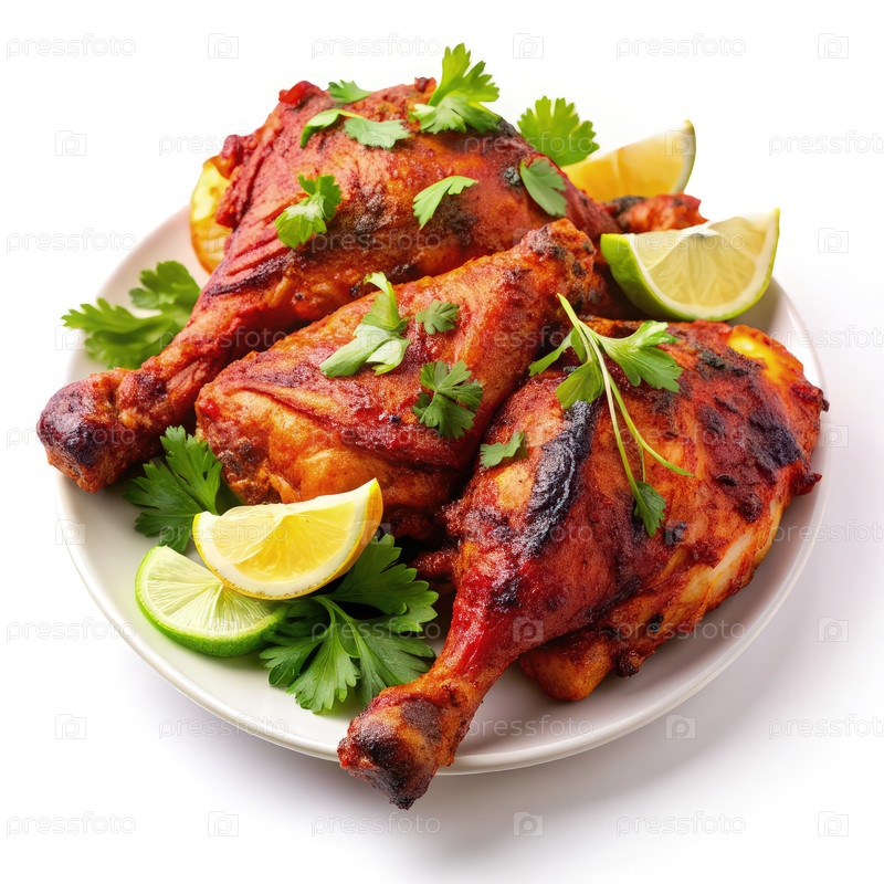 Курица тандори, украшенная кориандром и лаймом на белом фоне
